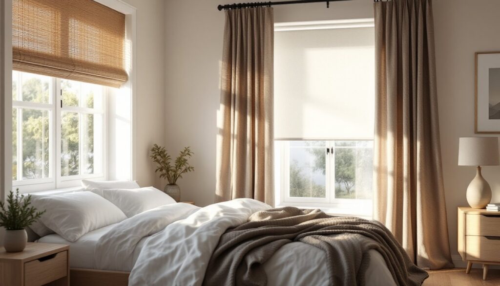 Natural material blinds add texture, warmth, and an earthy quality that softens modern or transitional bedrooms. They suit coastal, farmhouse, Scandinavian, and bohemian styles, and they pair well with wood furniture and neutral linens.